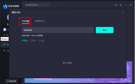 1、首先,你在steamOk免费领取了奇妙加速器兑换码并运行加速器